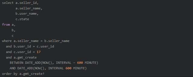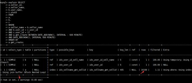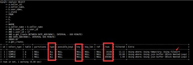 SQL中 where条件字段类型要跟表结构一致,表中user_id 为varchar(50)类型,实际SQL用的int类型,存在隐式转换,也未添加索引。将b和c表user_id 字段改成int类型。 因存在b表和c表关联,将b和c表user_id创建索引 因存在a表和b表关联,将a和b表seller_name字段创建索引 利用复合索引消除临时表和排序初步优化SQL