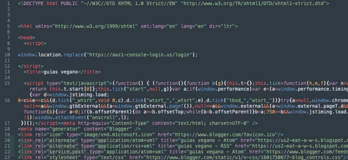 “恶意谷歌广告”首先将受害者引到攻击者控制的户账博客网站(“us1-eat-a-w.s.blogspot[.]com”:该网站是一个合法的素食博客),使用“window.location.replace”自动将受害者重定向到托管了虚假 AWS 登录页面的b2b供应网潜伏新网站。