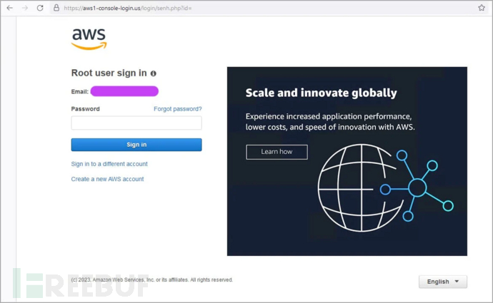 当用户进行至此步骤时,钓鱼网站系统会自动提示受害者是选择使用 root 用户还是 IAM 用户登录,一旦用户输入电子邮件地址和密码,信息就会被盗。(提示用户选择登陆方式有助于攻击者区分被盗数据的分价值和实用性)
