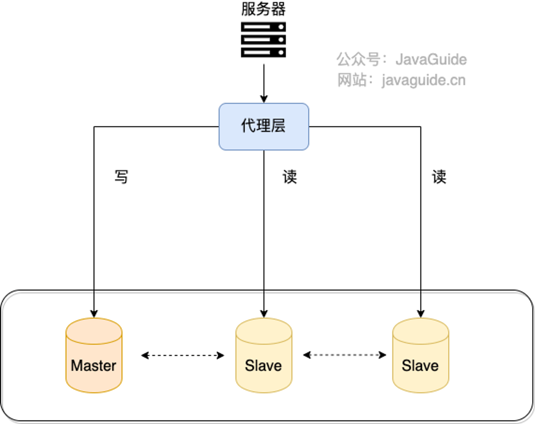 我们可以在应用和数据中间加了一个代理层。应用程序所有的数据请求都交给代理层处理,代理层负责分离读写请求,将它们路由到对应的数据库中。