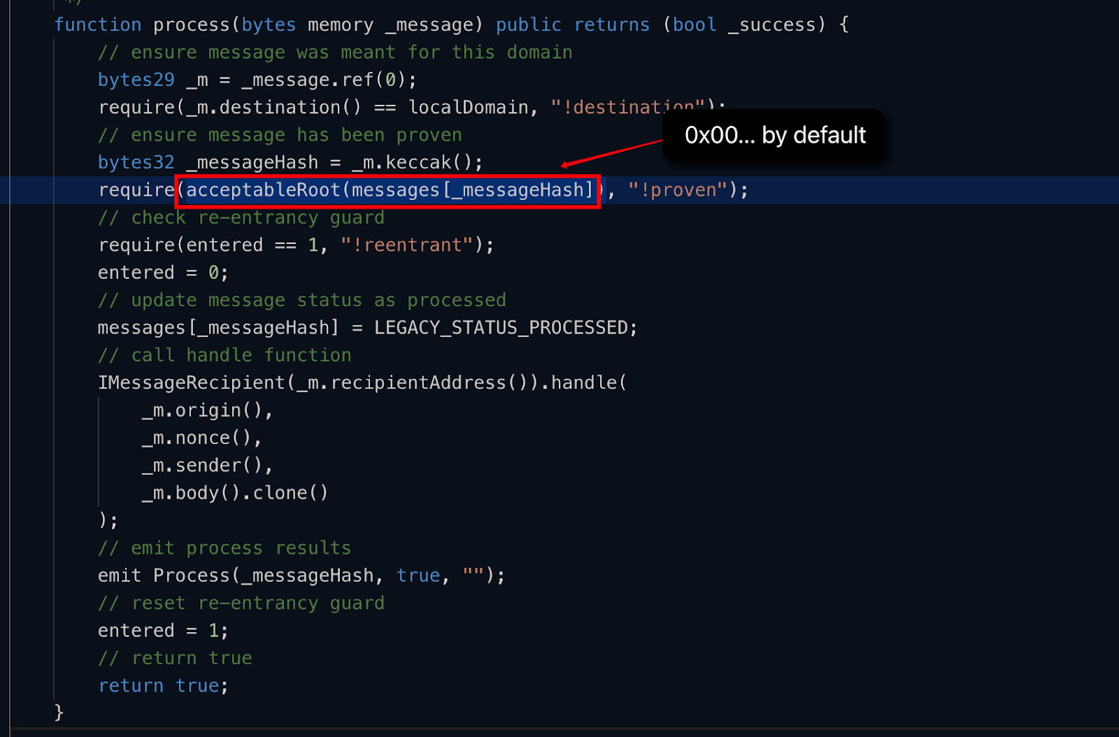 在process函数中,会调用acceptableRoot(messages[_messageHash]),这是用来检查root是否提交,以及timeout是否过期的。本例中messages[_messageHash]是0x000。