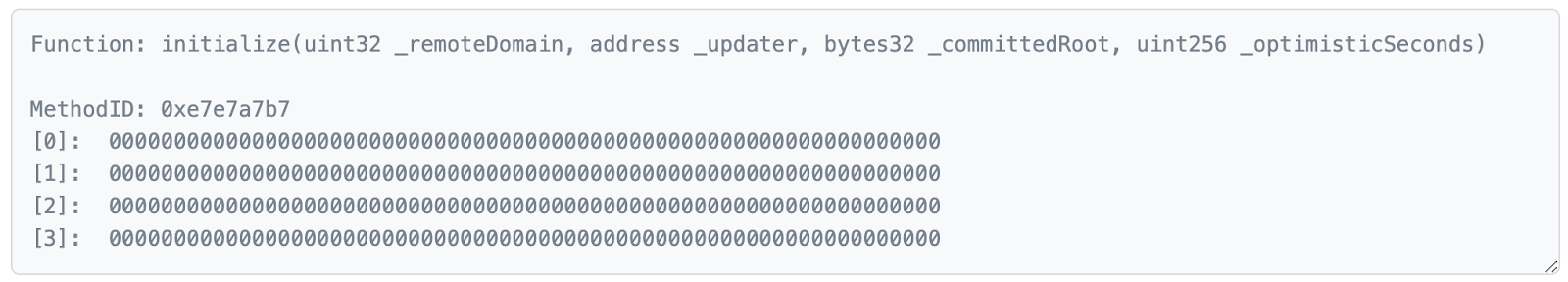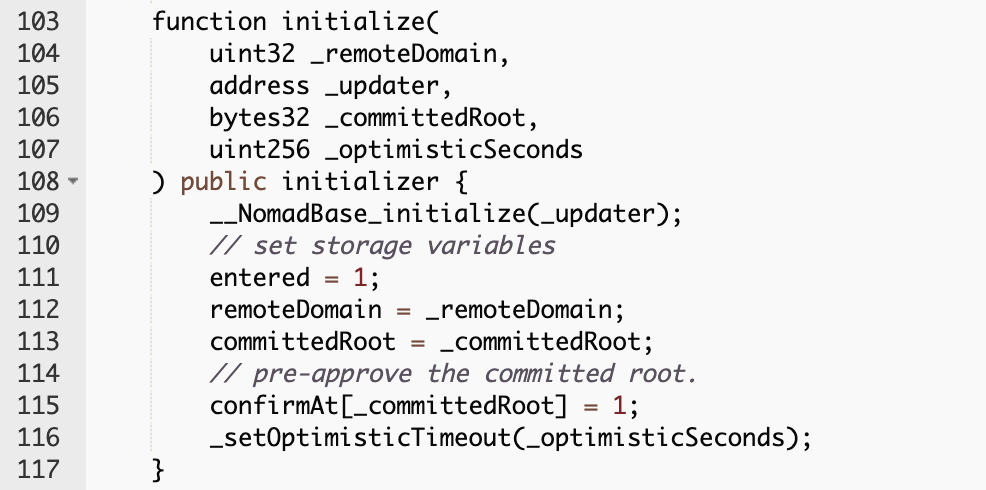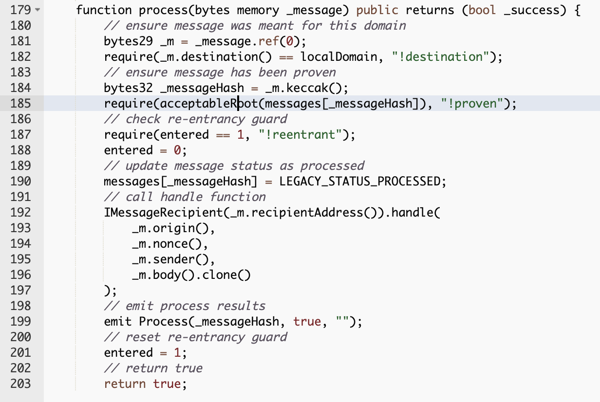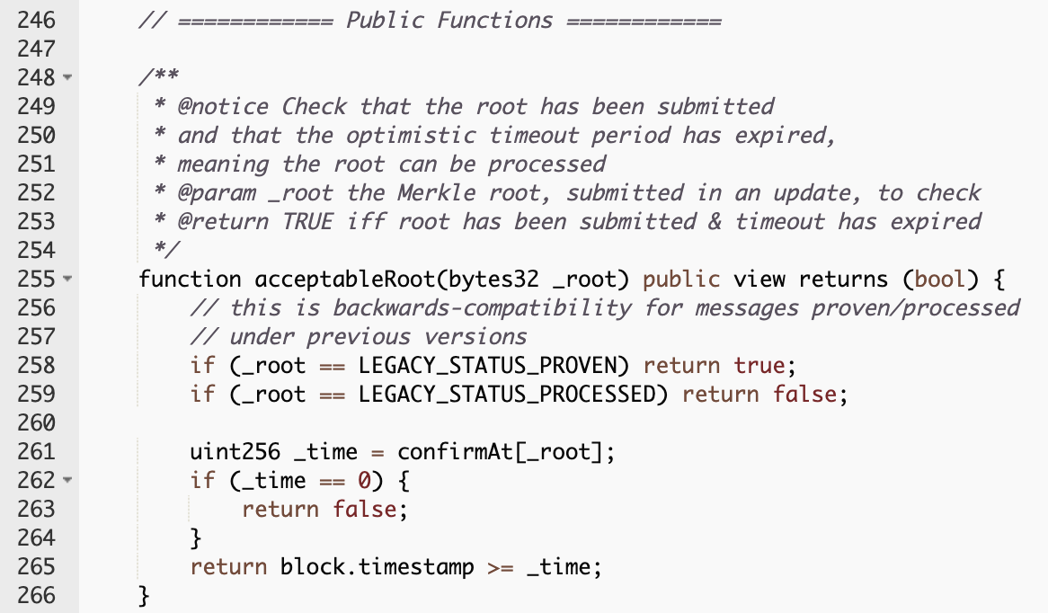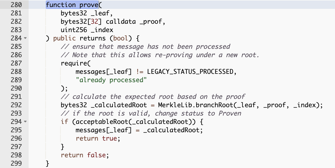 函数acceptableRoot(messages[_messageHash])返回true,消息就被证明了。在初始化时设置为0x0000,服务器托管因此是true(这也是部署时的错误所在)。