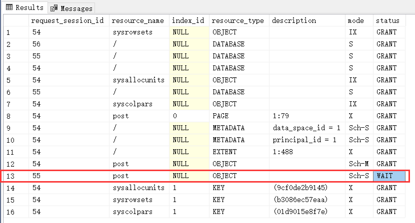 OBJECT_NAME(p.object_id) END AS resource_name, index_id, t.resource_type, t.resource_description AS description, t.request_mode AS mode, t.request_status ASstatus