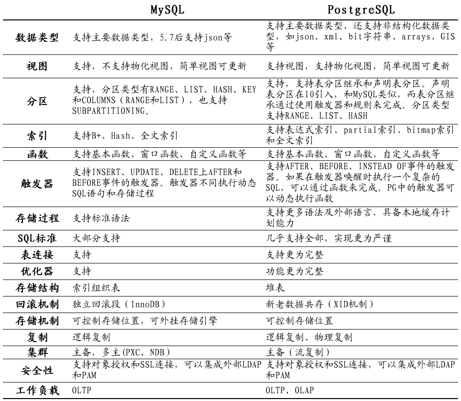 作为流行的开源数据库佼佼者,这两款产品各有其优势和特点。MySQL 数据库,在二十多年前随着互联网兴起,得到了广泛的应用,其以轻量化、简洁著称;特别是其核心的存储引擎-InnoDB,更以其稳定架构、卓越性能而成为默认存储引擎,得到大量应用。PostgreSQL 数据库,则是一种典型的学院派产品,业内常用一种说法,称其是作为最为强大的开源数据库,具备大量企业级能力(如优化器等)。可以说,两个数据库各有所长,之前也在企业不同场景发挥着重要的作用。下表是针对两种数据库的功能对比。站群服务器