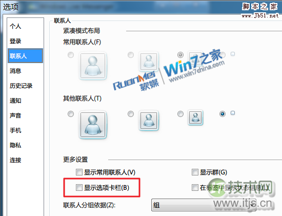 2、在“联系人”选项卡里,取消“显示选项卡栏”项,此项对应MSN主窗口大幅广告下面的企商汇一排广告按钮。