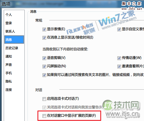 3、在“消息”选项卡里,取消“在对话框口中显示扩展的页脚”,此项对应MSN对话窗口下方的大幅广告。