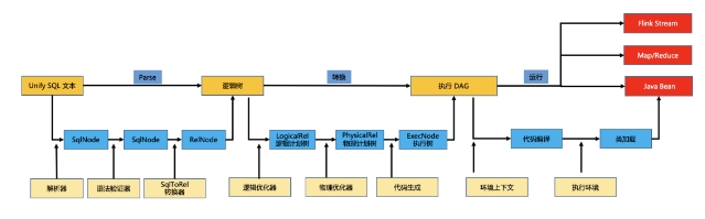 SQL解析:Calcite的SQL解析是通过JavaCC实现,使用JavaCC变成SQL语法描述文件,将SQL解析成未经校验(unvalided AST)的AST语法树。SQL校验:无状态校验,即验证SQL语句是否符合规范;有状态校验,通过和元数据验证SQL的schema,字段,UDF是否存在,以及类型是否匹配等。这一步生成的是未经优化的RelNode(逻辑计划树)SQL查询优化:对上面步骤的输出(RelNode),进行优化,这一过程会循环使用优化器(RBO规则优化器和CBO成本优化器),在保持语义等价的基础上,生成执行成本最低的SQL逻辑树(Lo)至于calcite的比较详细的原理,可以详解:Apache Calcite 处理流程详解(地址:https://xie.infoq.cn/article/1df5a39bb071817e8b4cb4b29),这里不详解了。有了calcite,解决了SQL->逻辑树,但是真正执行SQL计算的,还需要进一步将逻辑数转换成物理执行树(Physical Exec DAG),在这个DAG,是包含可执行的Java代码(JavaCode)片段,最后下发到不同执行环境,会被进一步串联可被环境执行的链路,比如在ODPS环境,会生成MR代码,在Flink环境,会被转换成Stream Operator,在Java环境,会被转换成Collector Chain,在Spring环境,会被转换成Bean组件。