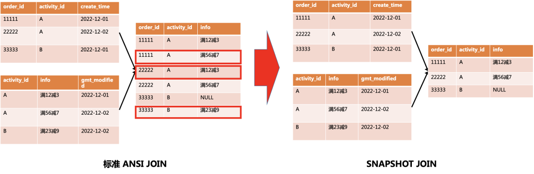 内存State是只保存到内存,一旦重新启动,就丢失历史数据,内存State通常用在单机有状态计算,并且容忍数据丢失。一般用在ODPS的MR程序里,因为一次MR调用状态计算,只需要当前执行上下文的累计结果,不需要放在全局缓存,不同批次之间的累计是通过MR API之间传输,内存State完全够用。Redis:对于需要跨多机状态计算,就会用到Redis作为后背存储,Unify SQL Engine在Java环境里默认是使用这个作为后背存储。Redis后备存储一般用在Java计算环境,数据会流经过不同生产机器,计算的中间结果需要全局可见。Hbase:如果状态数据超过100G,可以选择Hbase做为后背存储,性能虽然比不上Redis,但状态可以保存很长时间,对于长周期的状态计算非常有用。▐ JOIN语义Flink是可以支持双流Join,但是Flink的双流Join的语义完全照搬了SQL的JOIN语义,就是一边的数据会和另一边的所有数据JOIN,这个对于离线分析没有任何问题,但是对于实时计算是会存在重复计算,在有些场景还有损业务逻辑,比如:当订单流去双流JOIN优惠表的时候,就会出现这个问题,优惠表的数据是会不停变化的,但是我们希望以快照数据做为JOIN的依据,而不是把优惠变更的数据都复现一遍,Unify SQL Engine是做到后者语义的,也就是SNAPSHOT JOIN,也是业务场景常见的语义: