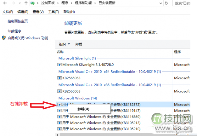 4,选中一下这个更新补丁(KB2952664/KB3035583),右键-卸载。假如没有找到这个补丁,则说明还没有被推送更新,则关闭系统更新功能即可。