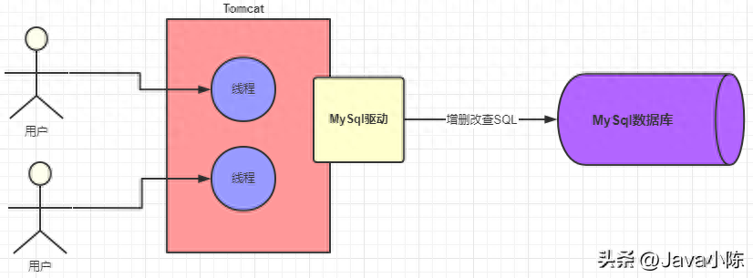 这样的话,在系统和 MySQL 进行交互之前,MySQL 驱动会帮我们建立好连接,然后我们只需要发送 SQL 语句就可以执行 CRUD 了。一次 SQL 请求就会建立一个连接,多个请求就会建立多个连接,那么问题来了,我们系统肯定不是一个人在使用的,换句话说肯定是存在多个请求同时去争抢连接的情况。我们的 web 系统一般都是部署在 tomcat 容器中的,而 tomcat 是可以并发处理多个请求的,这就会导致多个请求会去建立多个连接,然后使用完再都去关闭,这样会有什么问题呢?如下图: