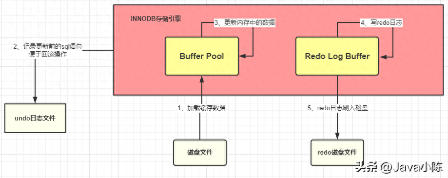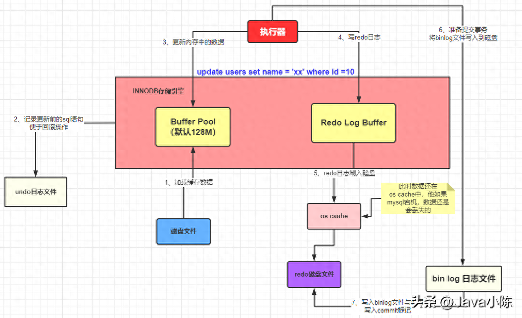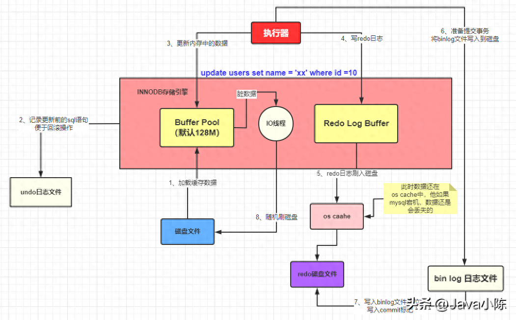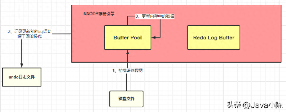 Buffer Pool 是 MySQL 的一个非常重要的组件,因为针对数据库的增删改操作都是在 Buffer Pool 中完成的Undo log 记录的是数据操作前的样子redo log 记录的是数据被操作后的样子(redo log 是 Innodb 存储引擎特有)bin log 记录的是整个操作记录(这个对于主从复制具有非常重要的意义)从准备更新一条数据到事务的提交的流程描述