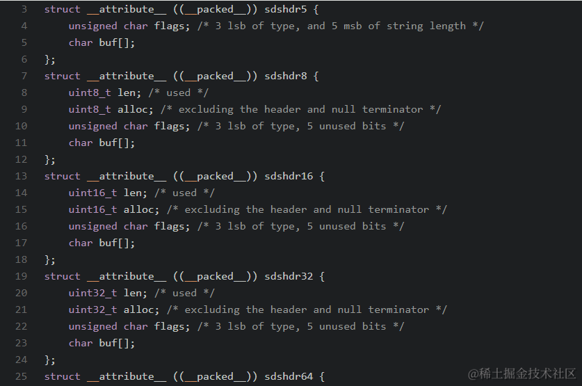 我们复制了其中一种SDS类型【sdshdr8】,它在Redis源码中的结构代码如下: