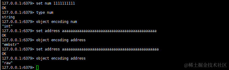 从图中我们可以可以发现,当输入纯数字字符串的时候,采用的是 int 编码,而字符串小于等于 44 则为 embstr,大于 44 则为 raw 编码