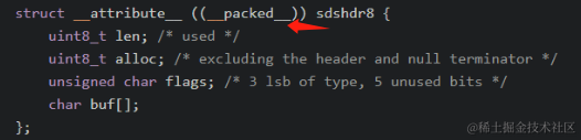 复制struct __attribute__ ((__packed__)) sdshdr8 { uint8_t len; uint8_t alloc; unsigned char flags; char buf[]; };1.2.3.4.5.6.字段说明:
