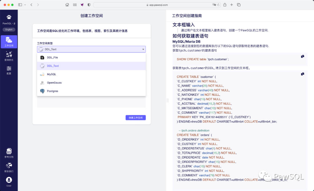 提示: 对于每一种工作空间创建方式,PawSQL提供了在线指南帮您创建您的工作空间。