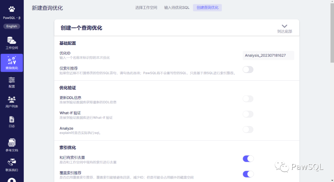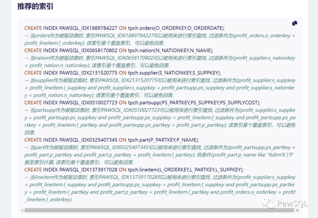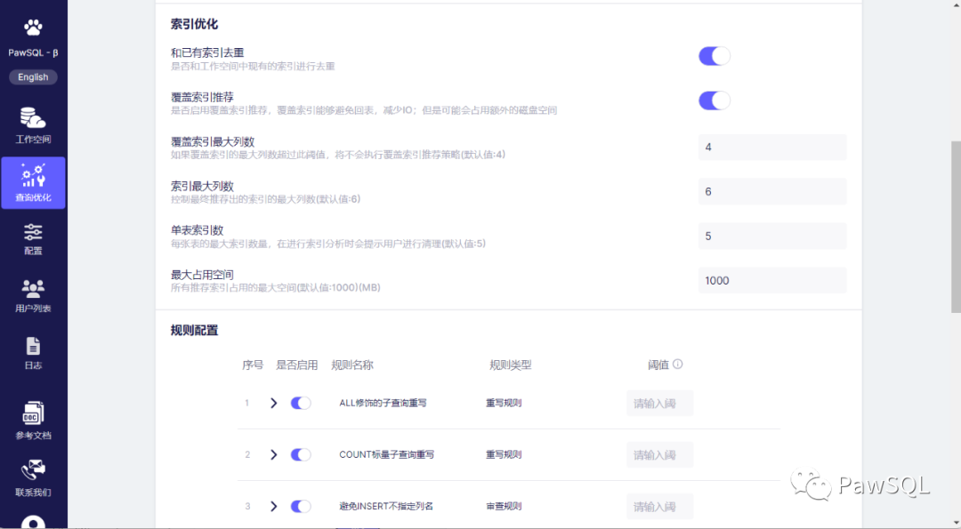 (3)索引推荐配置是否和现有索引去重,此选项表示推荐索引时,是否和现有索引去重。启用此选项的场景是不考虑删除现有的索引,因为输入的SQL只是并不能代表这个数据库上所有的SQL场景,所以只考虑新增对输入SQL有帮助的索引。如果能够确保输入的SQL包含此数据库所有的查询,那么只保留推荐的索引就可以了,这种情况下可以不选择此选项,并且使用新推荐的索引代替现有的索引。是否推荐覆盖索引,此选项表示推荐索引时是否考虑覆盖索引策略。覆盖索引可以让查询只访问索引而不需要访问数据表(请参考《高效索引的准则》),在一些场景下,覆盖索引能够大幅提示查询性能。但是覆盖索引会包含查询条件中没有使用的列,从而增加索引所占的磁盘空间大小。覆盖索引的最大列数,此项设置表示在进行覆盖索引推荐时,索引的最大列数限制。如以上所述,覆盖索引会包含查询条件中没有使用的列,从而增加索引所占的磁盘空间大小。此选项可以控制覆盖索引所占空间的大小,让PawSQL能够为用户提供一定空间限制的情况下利用覆盖索引的非回表特性。索引的最大列数,此选项限制索引的最大列数,索引会占用一定的磁盘空间,且太多列的索引会让索引树的层级加深,从而增加索引访问的代价。用户可以通过此项设置控制索引的最大列数。单表最大索引数目,如《高效索引的准则》中所述,索引不是免费的午餐,它会占用磁盘空间,并对对DML操作产生负面影响,因为对于数据库管理器写入表的每一行,它还必须更新任何受影响的索引。因此,PawSQL通过此选项来审查单表的索引数量,并进行警告提示。