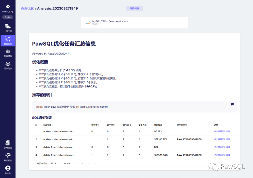 查询优化表示在您的工作空间内对一组SQL查询进行的性能优化诊断,一般包括SQL审查、重写优化、索引推荐等。