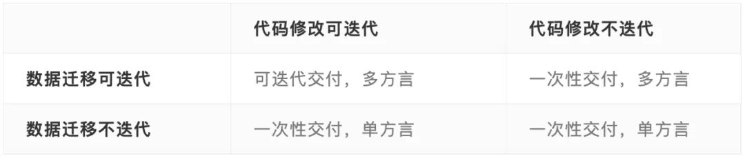 交付计划T-SQL的形态T-SQL的数量1.交付计划业务侧的用户数据是否迭代迁移、开发侧的代码能否迭代修改,将会直接决定T-SQL转换的交付计划,也会决定有几种方言的SQL会同时存在。