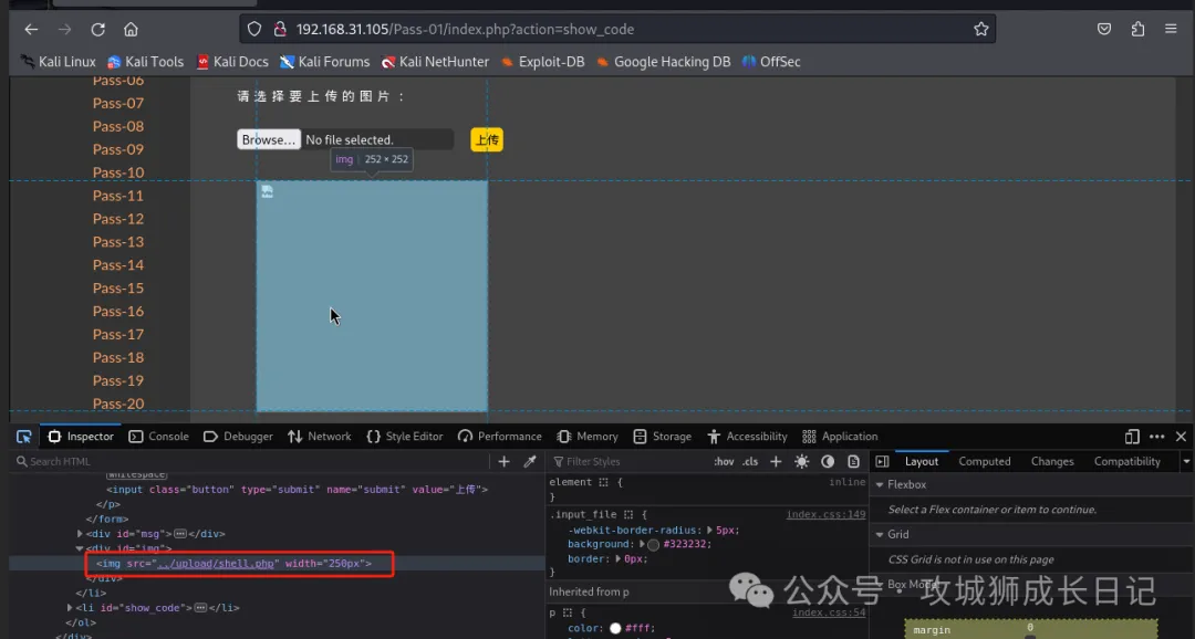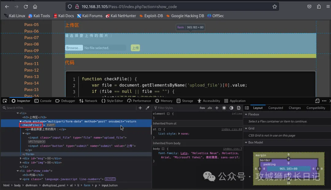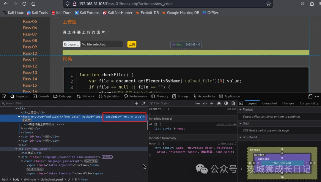 禁用 JavaScript:在浏览器中禁用 JavaScript,松绕然后重新加载页面并上传文件。这种方法简单直接,但在实际场景中并不总是可行。修改 HTML 代码:使用浏览器的开发者工具修改页面代码,去掉或修改验证函数。例如,将notallow="return checkFile()"改为 notallow="return true"。直接发送请求:使用工具如 BurpSuite 或 Postman 直接向服务器发送文件上传请求,绕过前端验证。实践绕过验证我们选择使用开发者工具修改HTML代码。具体步骤如下: