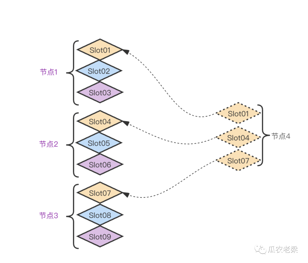 如下图所示,当集群中节点4下线,需要先将其拥有的槽位Slot01、Slot04、Slot07迁移走。