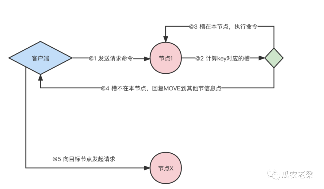@1 客户端发送请求命令到集群任意节点@2 计算key对应的槽,计算公式:slot=CRC16(key)&16383@3 槽在本节点,执行命令,每个实例维护自身负责的槽也维护其他实例负责的槽位@4 槽不在本节点,回复MOVE到其他节信息点@5 向目标节点发起请求