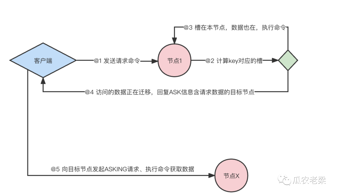 @1 发送请求命令@2 计算key对应的槽@3 槽在本节点,数据也在,执行命令@4 访问的数据正在迁移,回复ASK信息含请求数据的目标节点@5 向目标节点发起ASKING请求、执行命令获取数据