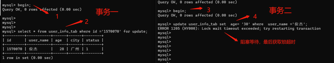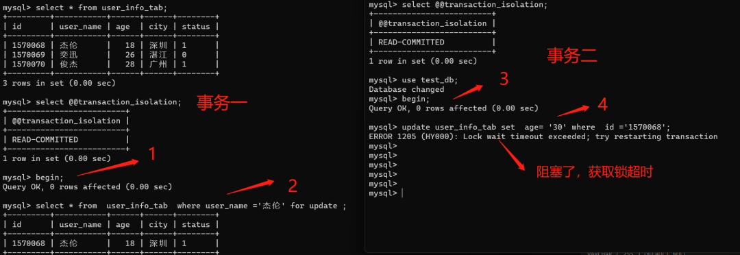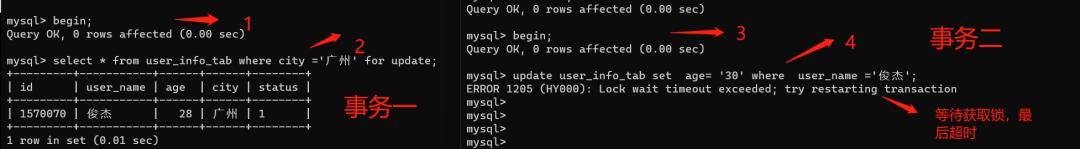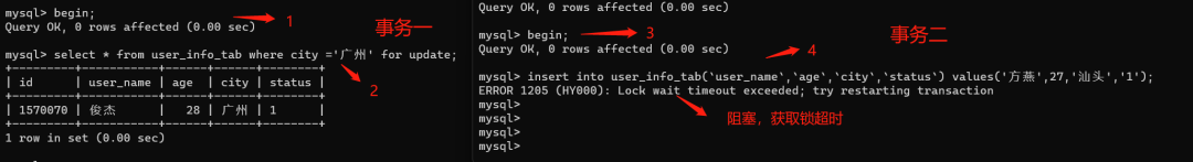 复制alter table user_info_tab add index idx_city (city);1.我们执行语句:select * from user_info_tab where city =广州 for update;然后开启另外一个事务去更新同一条数据,发现被阻塞了。如下图: