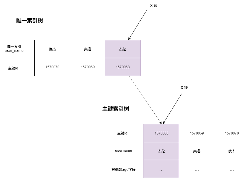 有些小伙伴可能还有疑问,为啥会有两把的X锁呢? 不是都锁住的是同一行嘛?其实RC隔离级别下,唯一索引的加锁是这样的: