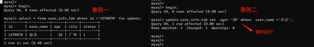 因为事务一的select......for update已经加了锁。那加的是行锁还是表锁呢?如果加的是表锁的话,我们更新其他行的记录的话,应该是也会阻塞的,如果是行锁的话,更新其他记录是可以顺利执行的。