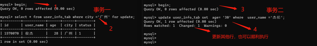 复制begin;select * from user_info_tab where city =广州 for update;1.2.接着开启事务二