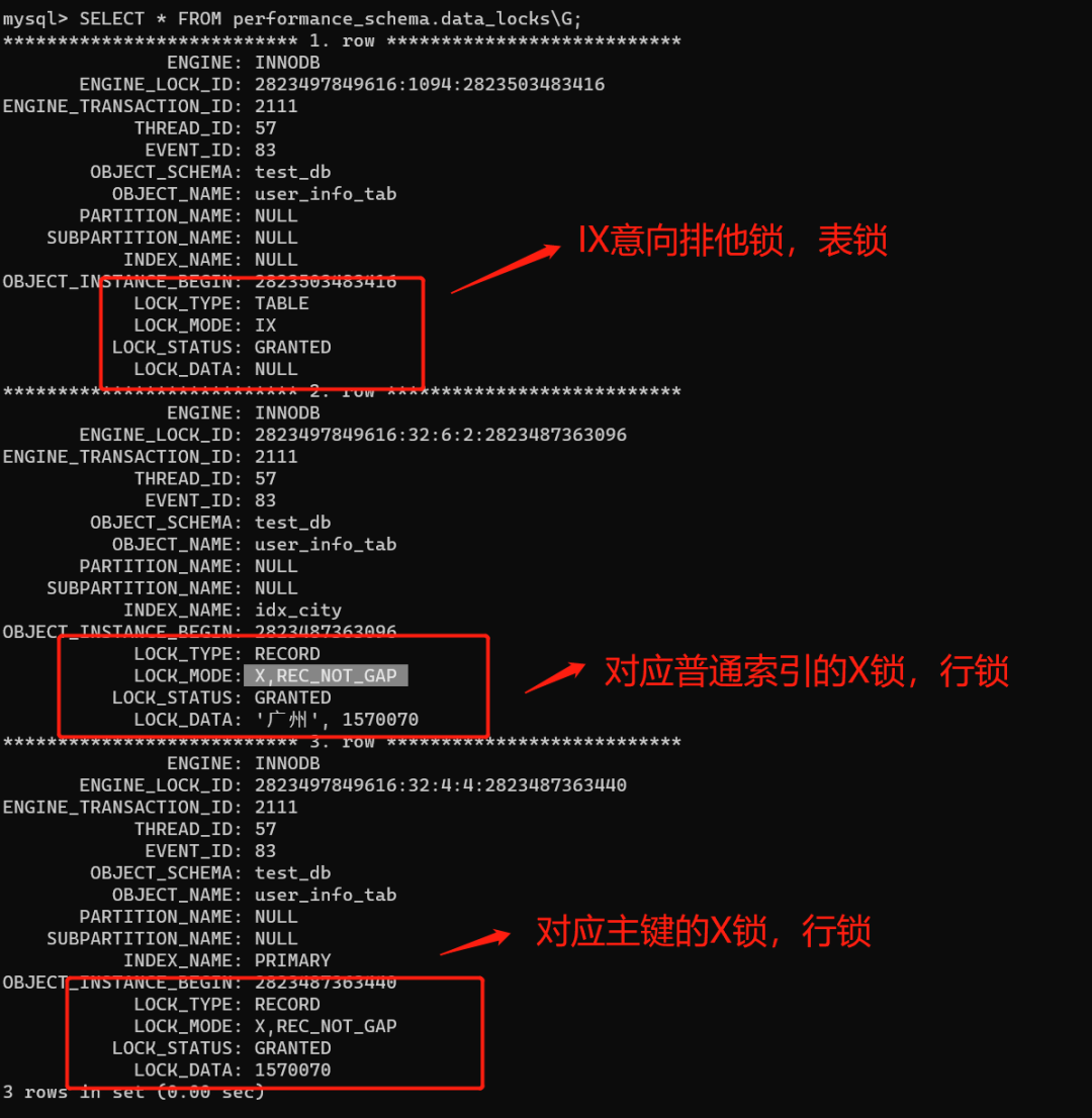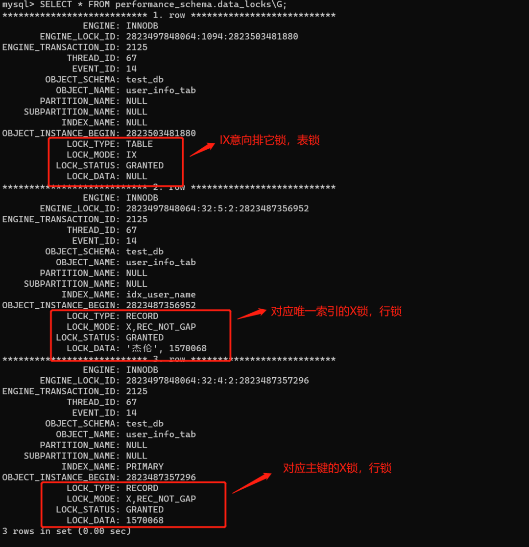 复制SELECT * FROM performance_schema.data_locks\G;1.如下图,select * from user_info_tab where user_name =杰伦 for update语句一共加了三把锁,分别是 IX意向排他锁(表级别的锁,不影响插入)、两把X排他锁(行锁,分别对应唯一索引,主键索引)