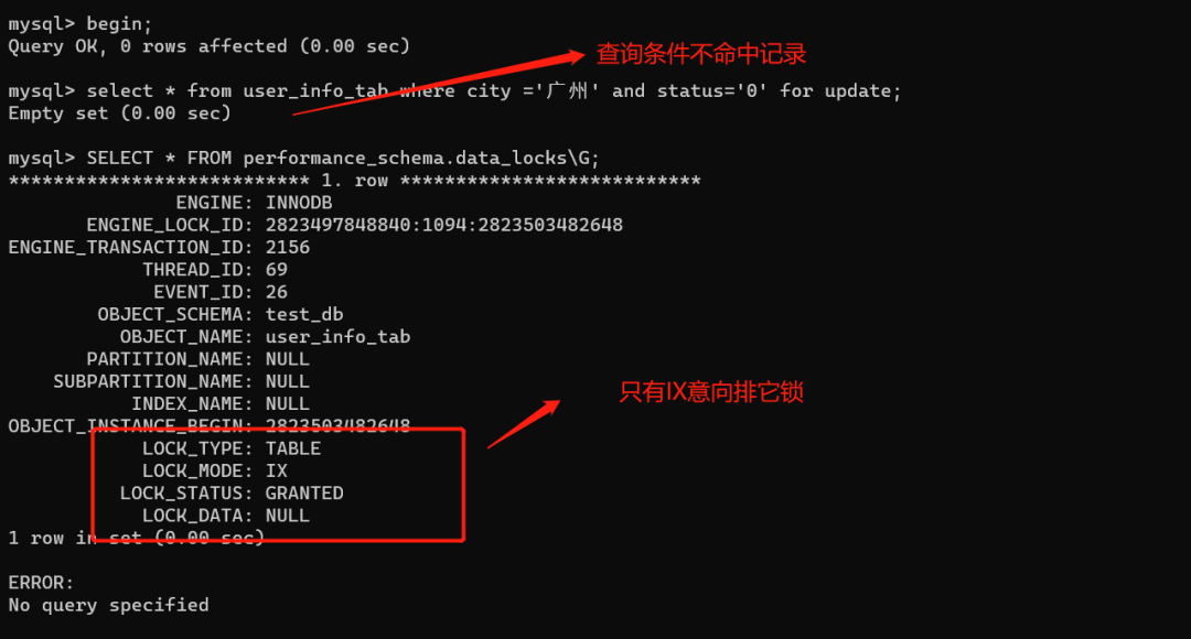 我们把查询条件改一下:select * from user_info_tab where city =广州 and status=0 for update;