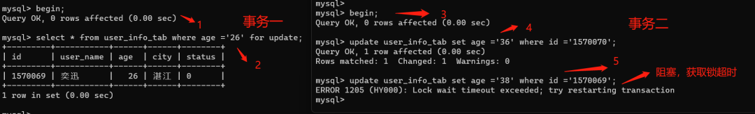 我们执行语句:select * from user_info_tab where id =1570070 for update;然后开启另外一个事务去更新数据同一条数据,发现被阻塞了。如下图: