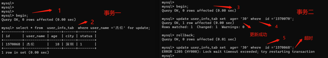 由上图可以发现,即使是RR数据库隔离级别,事务一先执行select...for update,然后事务一先更新别的行,发现可以顺利执行,如果执行更新for update的那一行,还是会阻塞超时。