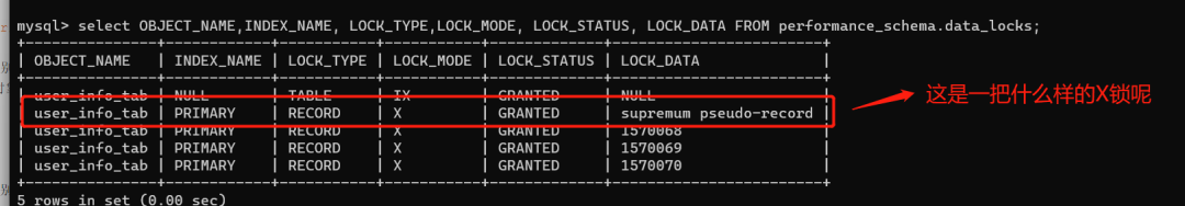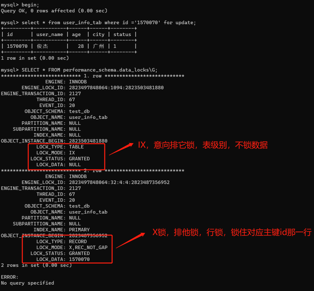 复制begin;select * from user_info_tab where id =1570070 for update;SELECT * FROM performance_schema.data_locks\G;1.2.3.大家可以看下,跟我们的推测是一样的: