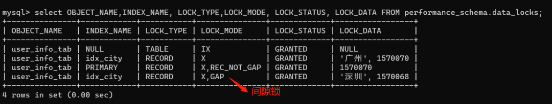我们看一下select * from user_info_tab where city =广州 for update;到底加了什么锁,如下图: