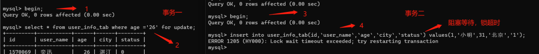 复制begin;insert into user_info_tab(id,`user_name`,`age`,`city`,`status`) values(1,小明,31,北京,1);1.2.大家可以看下,阻塞了,:
