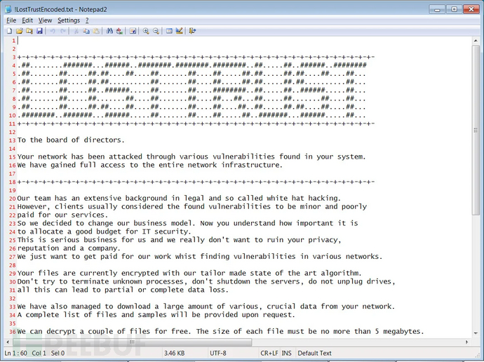 接下来,LostTrust勒索软件会在目标设备上的每一个被加密的文件夹中创建一个名为“!LostTrustEncoded.txt”的勒索软件信息文件,而且攻击者还会在勒索信息中声称自己以前是白帽黑客,但是因为收入微薄(客户认为漏洞严重程度非常低,所以报酬低),所以才会做勒索软件攻击这样的事情。