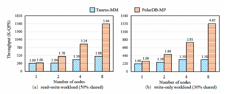 SysBench工作负载测试,8节点场景下,PolarDB吞吐量是Taurus多主架构数据库的3倍