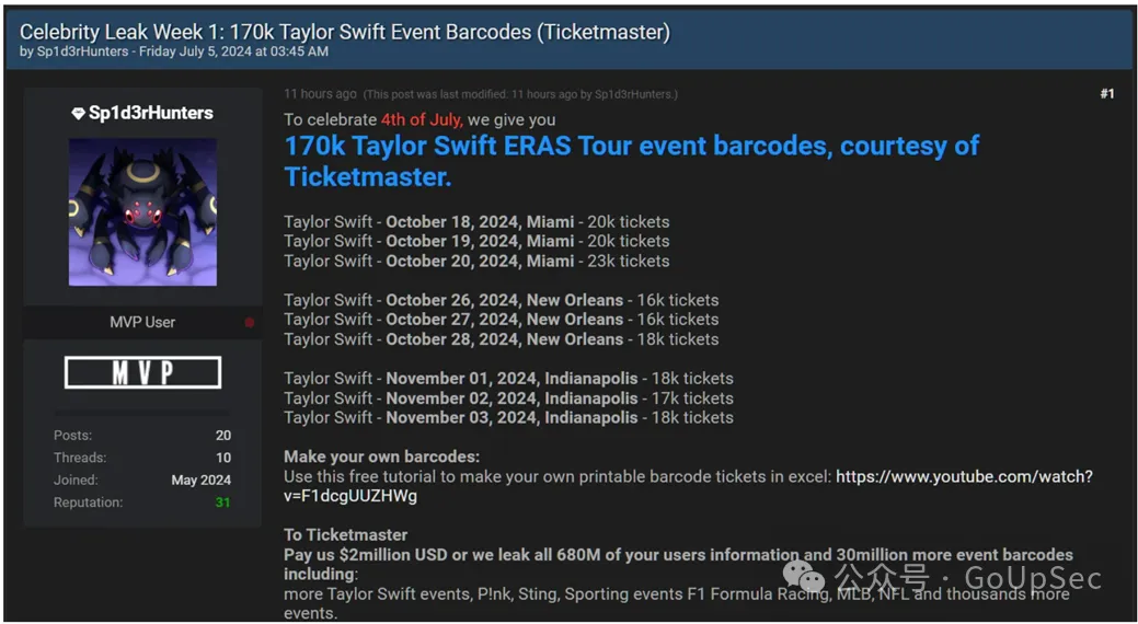 “支付200万美元,否则我们将泄露你们的6.8亿用户信息和另外3000万个活动条码,包括更多的泰勒·斯威夫特活动、P!nk、Sting、体育赛事F1方程式赛车、MLB、NFL等数千个活动,”Sp1d3rHunters在帖子中写道。