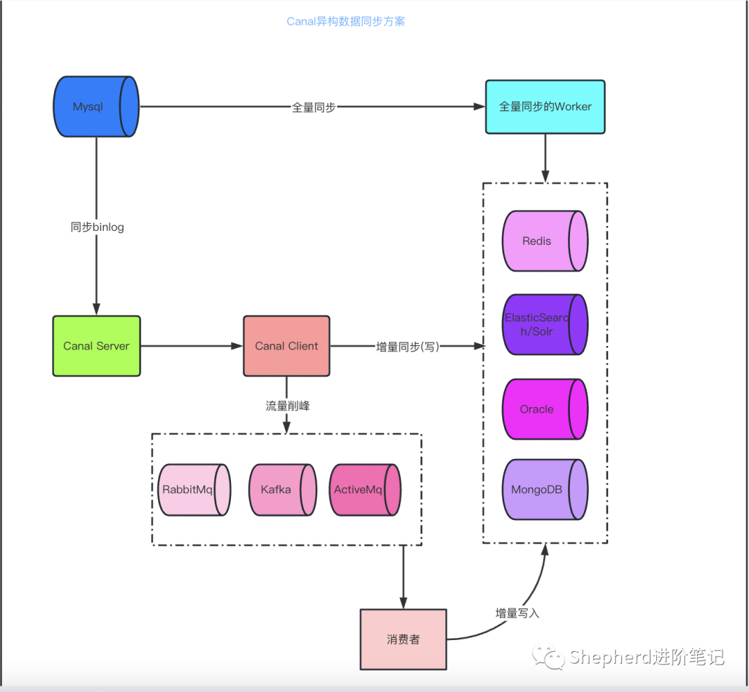 答案是阿里的开源项目Canal,就是用来解决异构数据源数据同步这个问题的,Canal项目利用了MySQL数据库主从同步的原理,将Canal Server模拟成一台需要同步的从库,从而让主库将binlog日志流发送到Canal Server接口。Canal项目对binlog日志的解析进行了封装,我们可以直接得到解析后的数据,而不需要理会binlog的日志格式。而且Canal项目整合了zookeeper,整体实现了高可用,可伸缩性强
