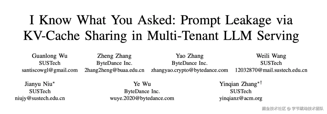 抖音集团安全研究团队和南方科技大学可信系统安全实验室合作的泄露享漏研究论文揭示了大语言模型安全领域服务框架的侧信道漏洞,利用多租户场景下的风险KV缓存共享机制精确恢复了用户提示词。本工作成果《I Know What You Asked: Prompt Leakage via KV-Cache Sharing in Multi-Tenant LLM Serving》已被安全领域顶级会议NDSS 2025接收。抖音多租洞