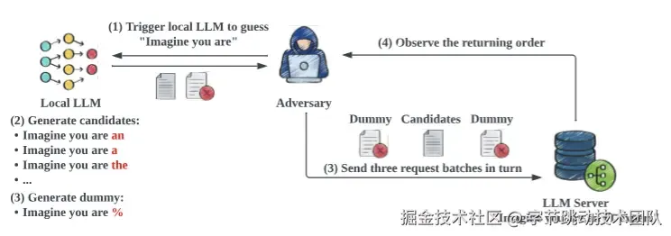 如下图所示,假设目标语句是“Imagine you are an IT expert”,攻击者已经成功还原出“Imagine you are”,并企图还原出下一个token “an”。