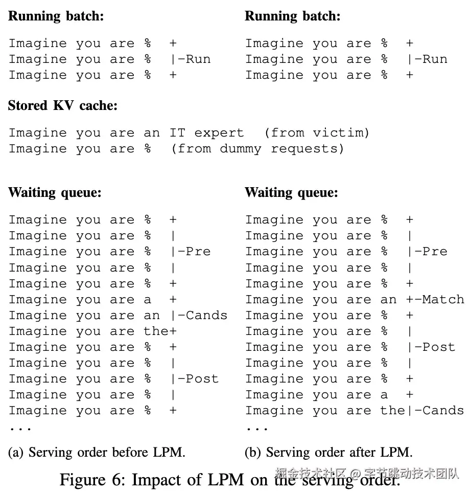 没有触发KV缓存共享:对于没有触发的场景,dummy请求的匹配长度为4(在第一个dummy请求被处理后后续请求都会有更长的匹配长度),而candidates请求的匹配长度为3。所以具体处理顺序依次为:第一个dummy batch,第二个dummy batch,和candidates batch。触发KV缓存共享:对于成功触发KV缓存共享的场景,dummy请求的匹配长度依旧为4,此时成功匹配的匹配长度也为4,其他的未匹配的请求的匹配长度为3。所以此时的具体处理顺序为:第一个dummy batch,匹配到的请求,第二个dummy batch,和其余的candidates。这里第二个dummy batch可以帮助放大顺序改变带来的差异,从而能够令攻击者在端侧判断出顺序的改变。