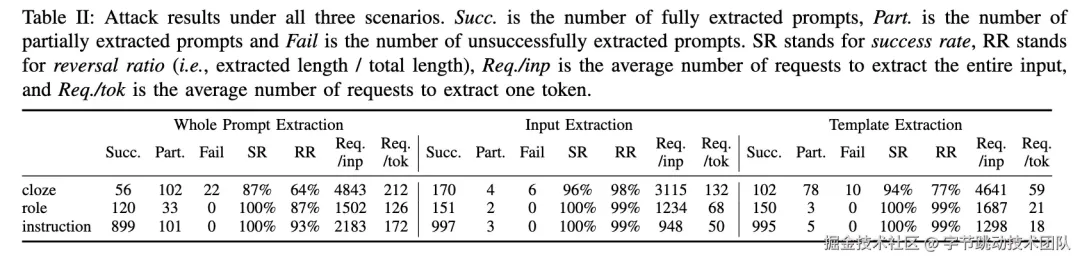 下图展示了攻击的最终效果。结果表明,在Llama2-13B模型上,攻击者在知晓提示模版来回复提示输入上成功率达99%,知晓提示输入恢复提示模板成功率为98%,甚至在无任何背景知识恢复全部请求也有95%的成功率。