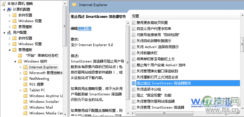 2、用组然后依次展开“管理模板→Windows组件→Internet explorer”项,免费信息发布网策略在窗口的上网速度右侧查找到“阻止绕过SmartScreen筛选器警告”并双击它;