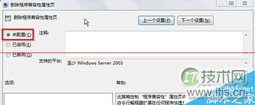 5、在“删除程序兼容性属性页”面板上,选中“未配置”,再点击应用按钮完成设置。