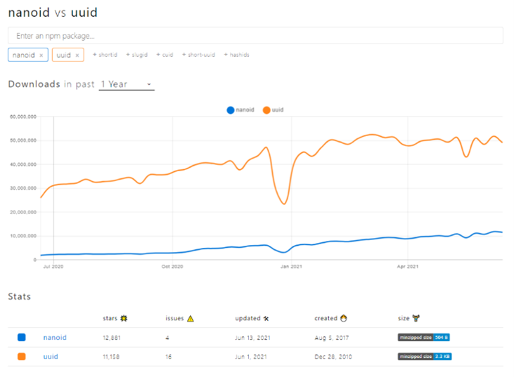 更小NanoID 只有 108 个字节那么大。与 UUID 不同,NanoID 的大小要小 4.5 倍,并且没有任何依赖关系。此外,大小限制已用于将大小从另外 35% 减小。大小减少直接影响数据的大小。例如,使用 NanoID 的对象小而紧凑,能够用于数据传输和存储。随着应用程序的增长,这些数字变得明显起来。