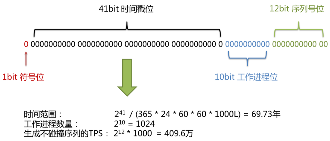 使用雪花算法生成的主键,二进制表示形式包含 4 部分,从高位到低位分表为:1bit 符号位、41bit 时间戳位、10bit 工作进程位以及 12bit 序列号位。