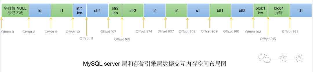 示例表和内存布局图都有了,接下来我们对照着图来分析一下各个字段对应的内存空间的情况: